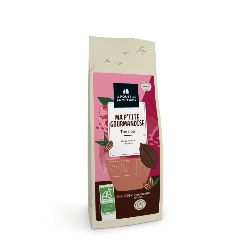 Ma P’tite Gourmandise est un thé noir délicieusement parfumé aux notes de cacao, d’amande et de rhubarbe. Une création réconfortante et généreuse qui vous rappellera les gâteaux au chocolat de votre enfance et accompagnera vos instants de douceur.